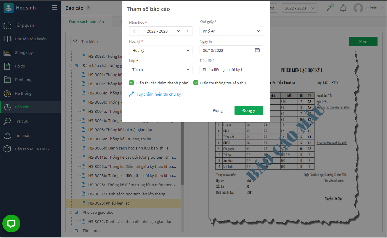 - Nhấn Đồng ý. Phần mềm trả ra phiếu liên lạc theo thiết lập bên trên. Anh/chị có thể chọn tải file dưới nhiều định dạng (PDF, Excel, Word).