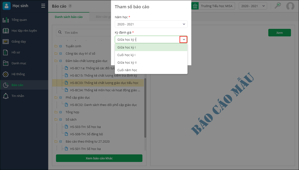 - Khai báo tham số trên báo cáo: Chọn năm học và Kỳ đánh giá
