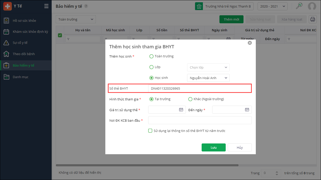 - Hình thức tham gia: Hình thức tham gia BHYT của học sinh: Tại trường/Khác(Ngoài trường)