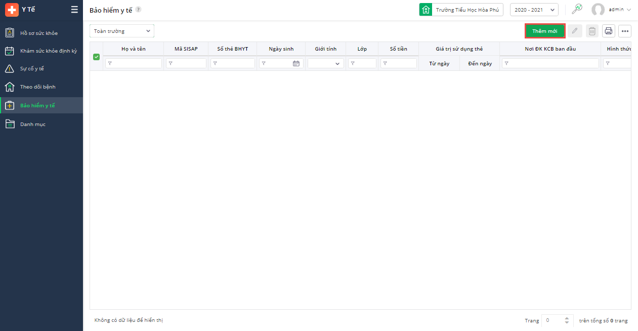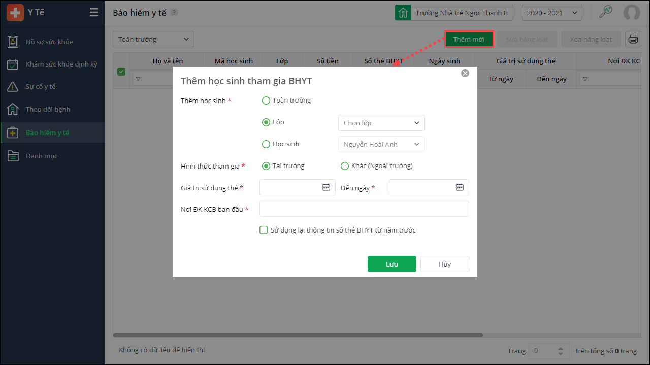 - Nhấn Thêm mới để thêm học sinh tham gia bảo hiểm y tế.