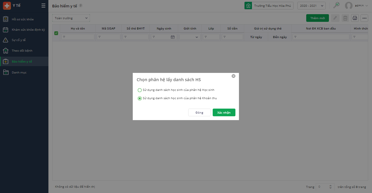 - Các đơn vị sử dụng phân hệ Học sinh hoặc Khoản thu để quản lý học sinh có thể thiết lập Chọn phân hệ lấy danh sách học sinh trên phân hệ Y tế.