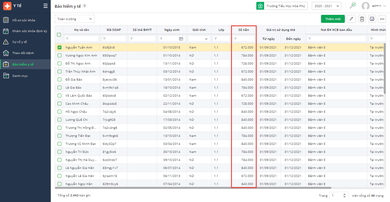 - Trường hợp lấy danh sách học sinh từ phân hệ Khoản thu, thông tin Số tiền sẽ tự động lấy lên theo số tiền học sinh đã nộp. Trường hợp lấy danh sách học sinh từ Phân hệ học sinh, thông tin Số tiền (số tiền BHYT) đã thu sẽ bị bỏ trống.