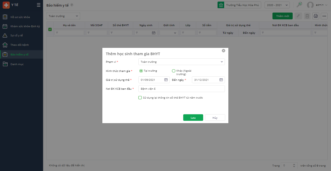 - Nhấn Thêm mới để thêm học sinh tham gia bảo hiểm y tế.