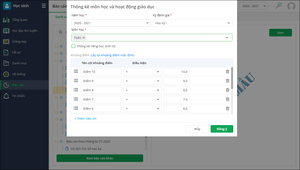 - Thiết lập lại các khoảng điểm trên báo cáo, nhấn vào đây để thêm khoảng điểm in lên báo cáo.