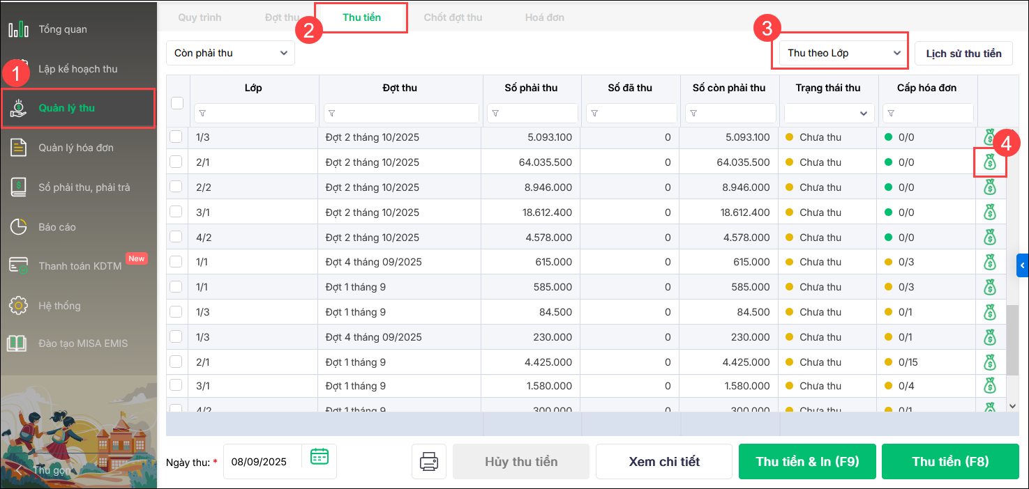 - Vào Quản lý thu\Thu tiền, chọn Thu theo lớp. Tại lớp cần thu chọn vào biểu tượng túi tiền cuối dòng để thu tiền cho cả lớp.