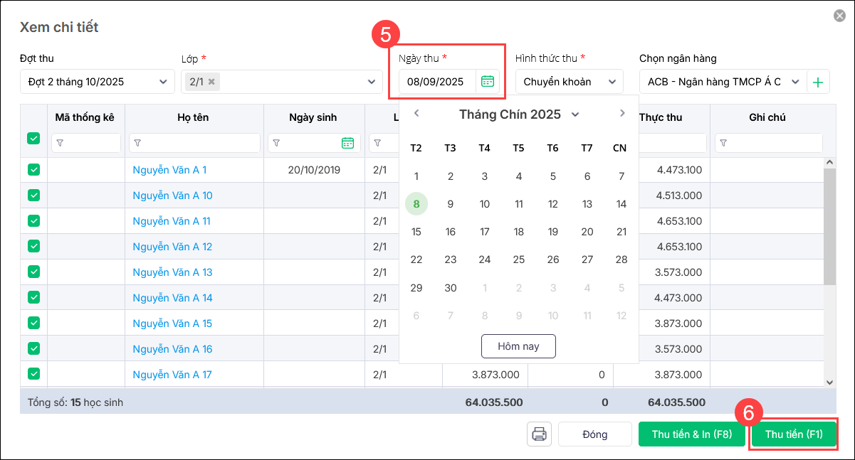 2. Chọn lại Ngày thu về ngày thu thực tế và xác nhận Thu tiền.