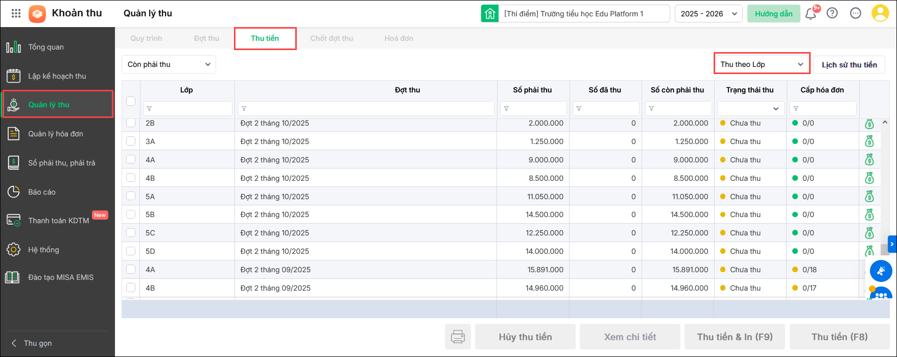 - Tuy nhiên, danh sách chỉ hiển thị lớp chưa thu, không hiển thị được lớp đã phát sinh thu tiền