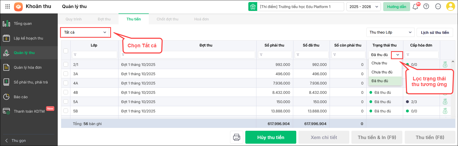 - Tại cột Trạng thái thu, chọn lọc theo Chưa thu, Chưa thu đủ hoặc Đã thu đủ và xem các lớp đã phát sinh thu tiền