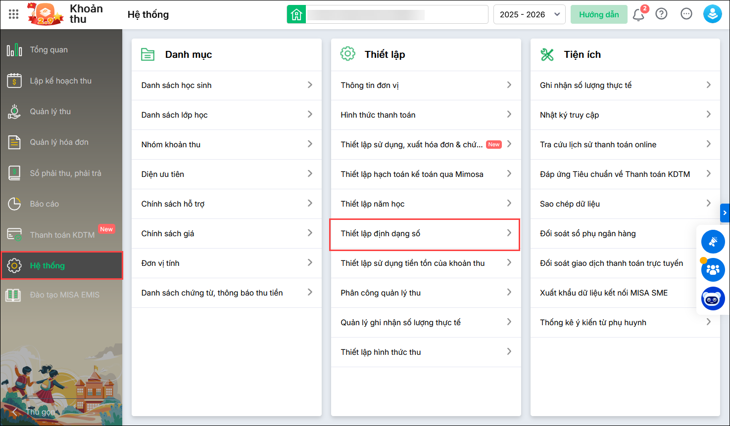 - Vào Hệ thống\Thiết lập định dạng số.