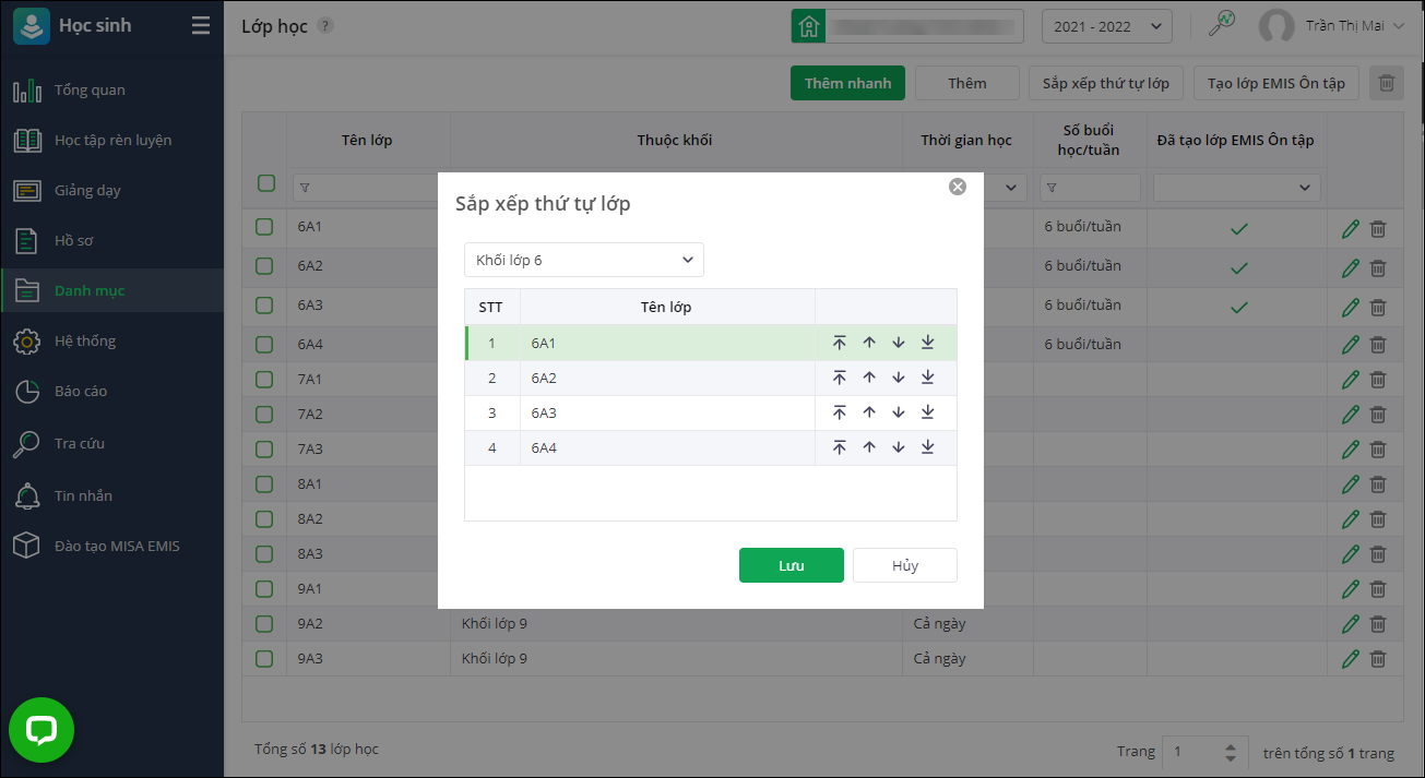 2. Lựa chọn khối lớp cần sắp xếp, nhấn biểu tượng mũi tên lên xuống để sắp xếp thứ tự.