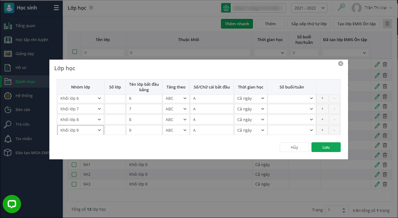 • Các lớp được đặt tên theo thứ tự A, B, C,… (VD: 2A, 2B, 2C). Thực hiện nhập Tên lớp bắt đầu bằng 2 tương ứng với từng khối lớp, Tăng theo ABC và Số/Chữ cái bắt đầu là A.