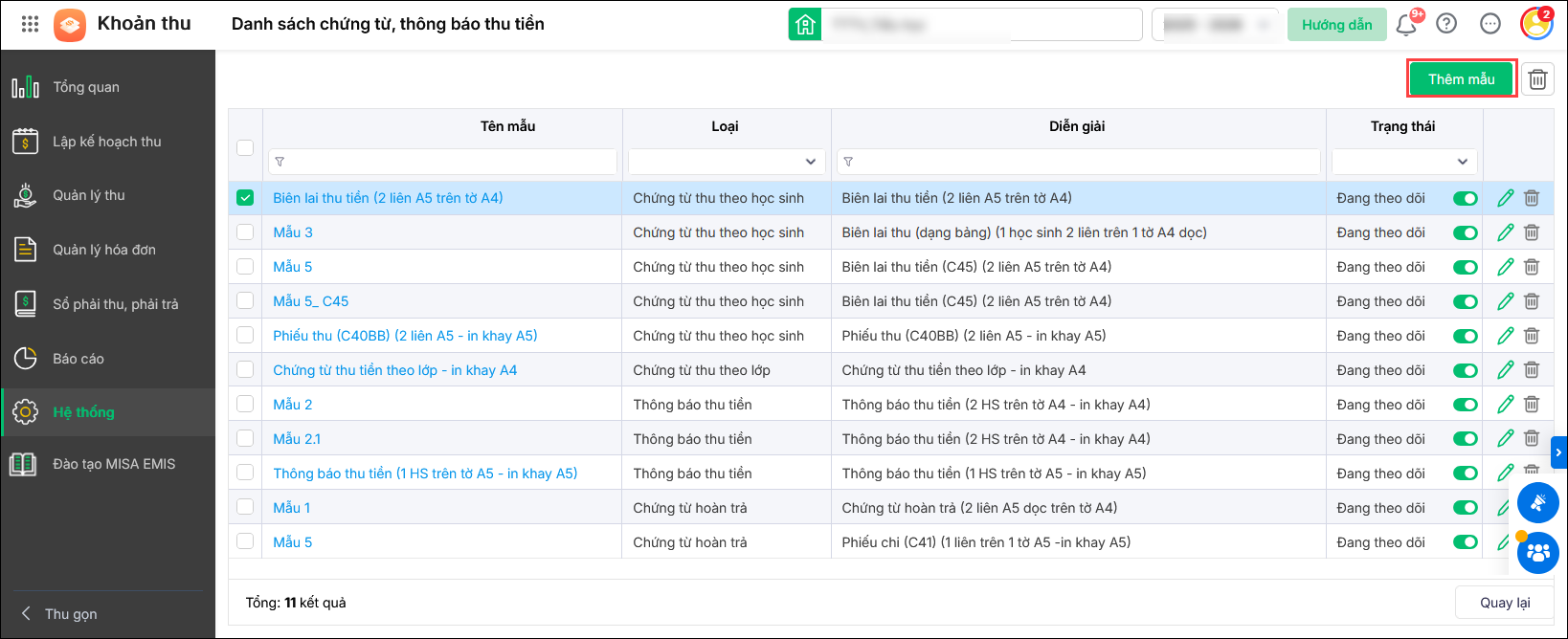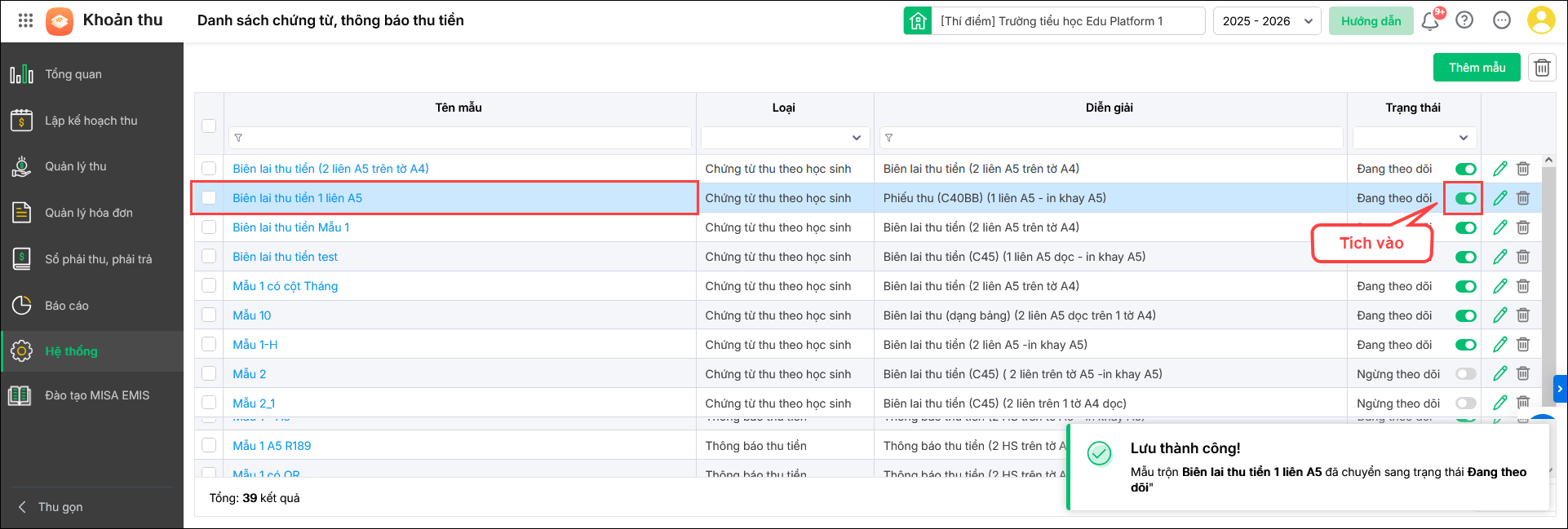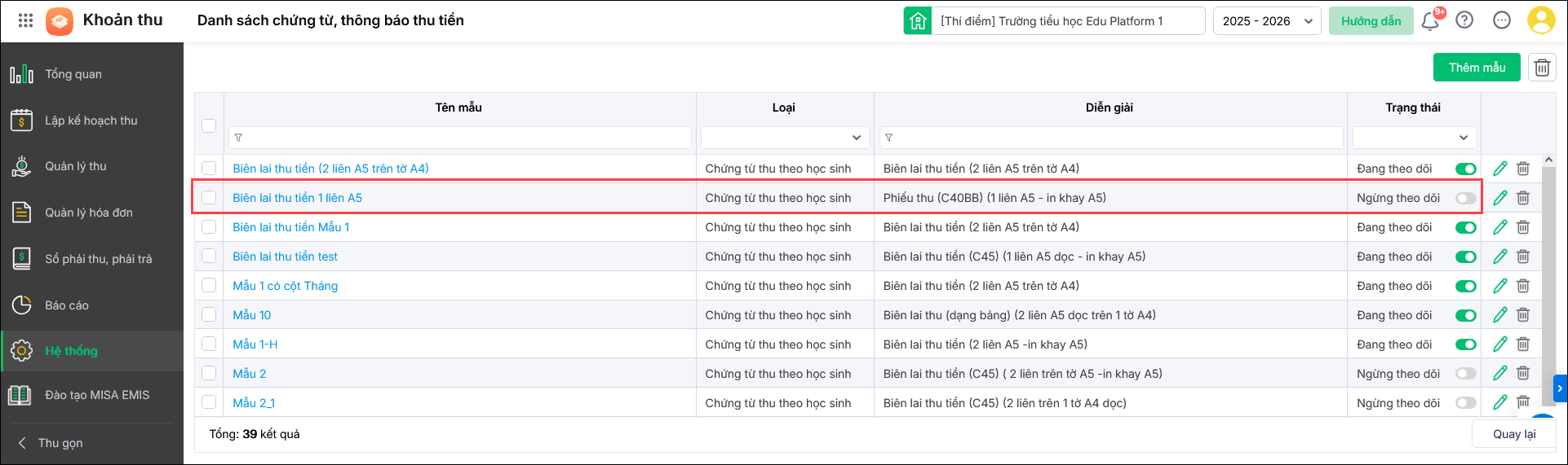 2. Trên danh sách chứng từ, thông báo thu tiền, kiểm tra mẫu 1 liên ở cột trạng thái để Ngừng theo dõi