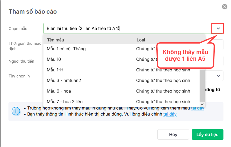 In chứng từ thu tiền học sinh nhưng không thấy mẫu Biên lai (hoặc phiếu thu) 1 liên khổ A5 để chọn