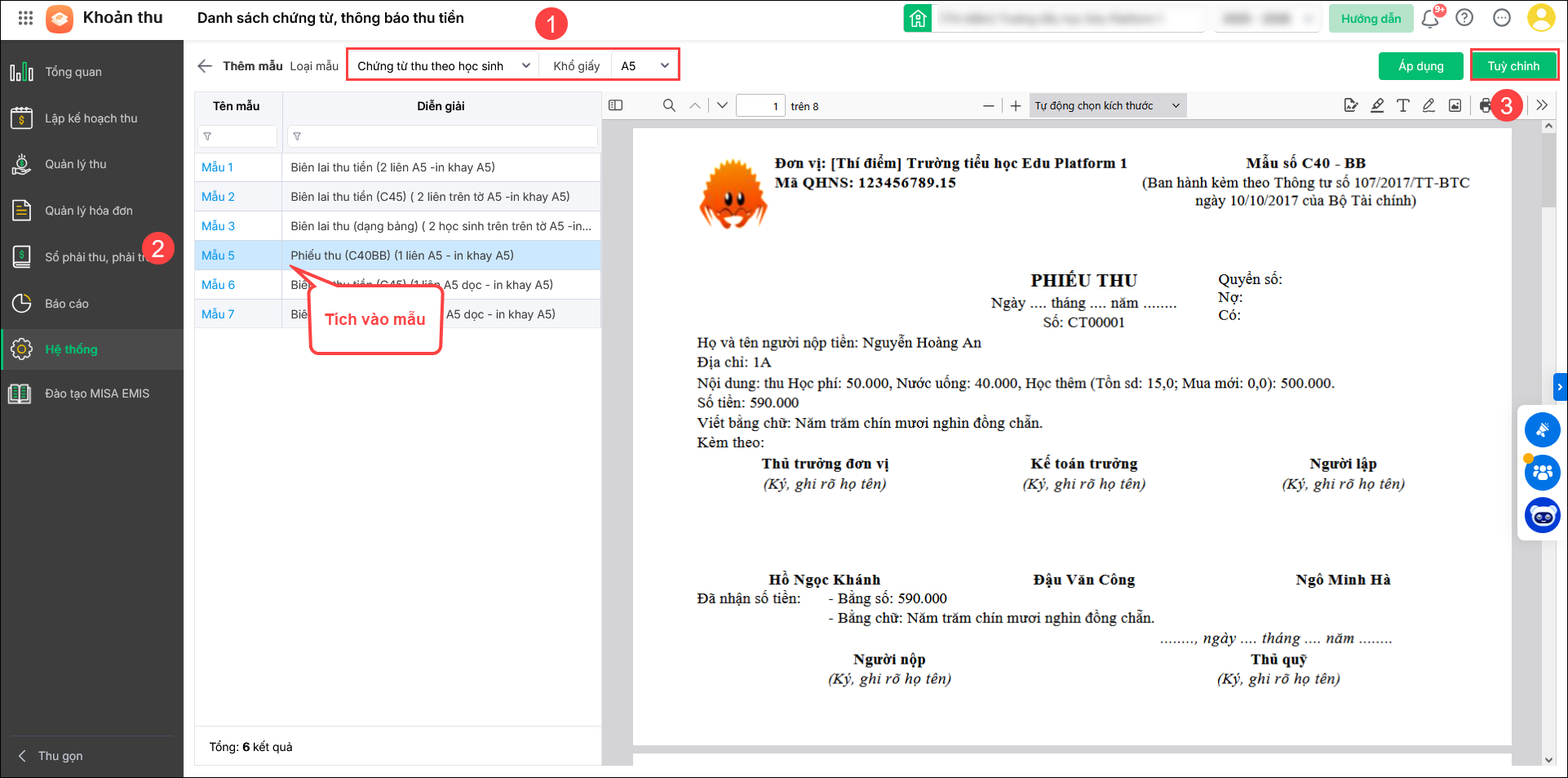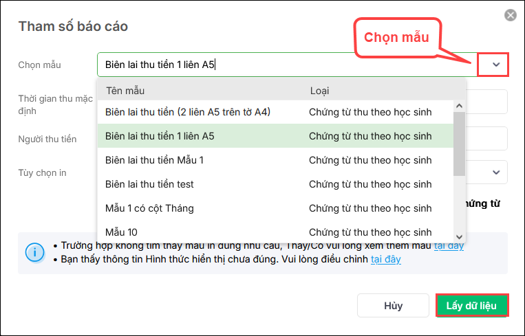 • Chọn loại mẫu: Chứng từ thu theo học sinh hoặc thông báo thu tiền