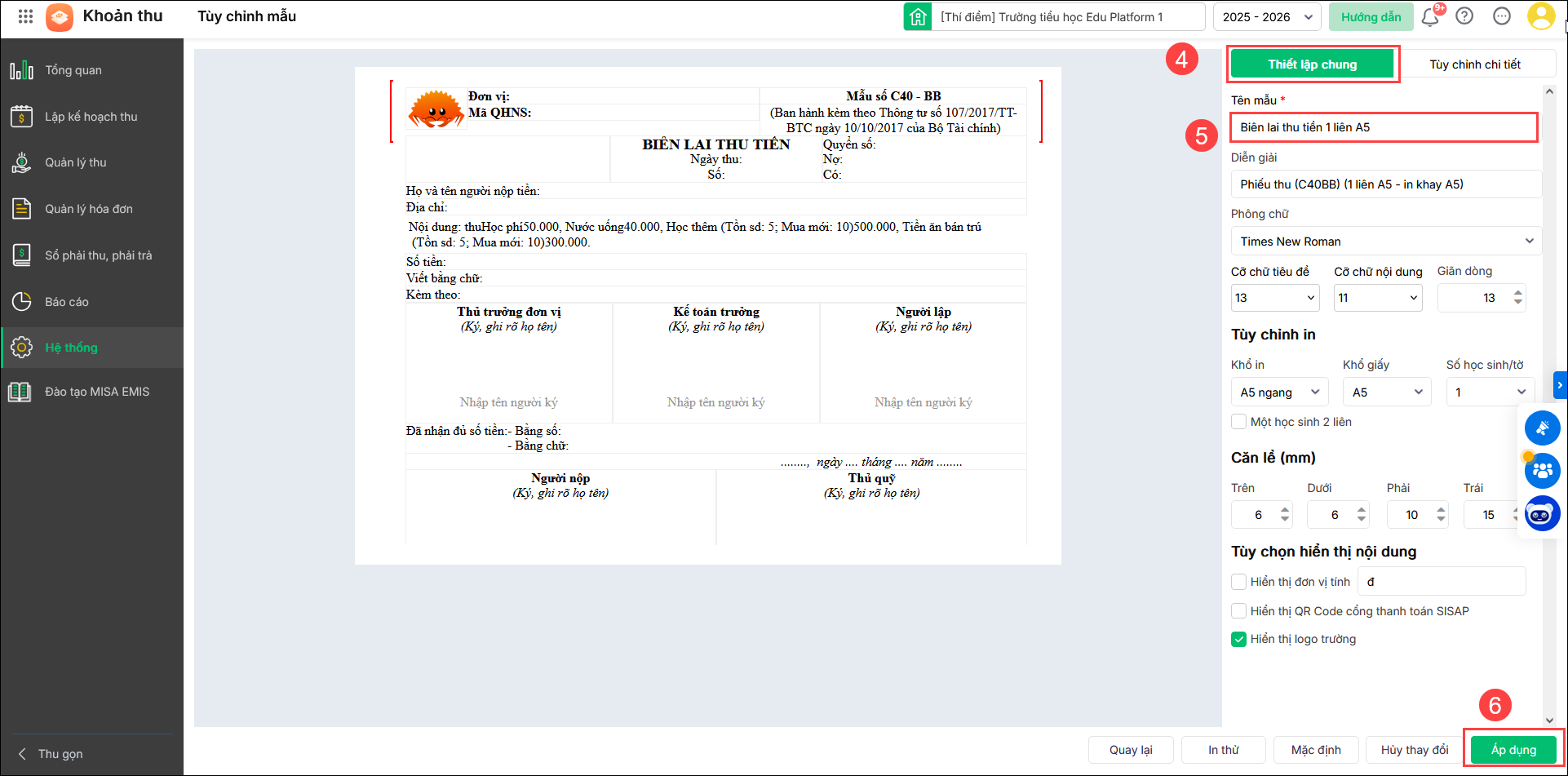 • Tích vào Thiết lập thông tin chung: Sửa lại tên mẫu để chọn trên giao diện in cho dễ. Ví dụ đặt tên mẫu: Biên lai thu tiền 1 liên mẫu A5