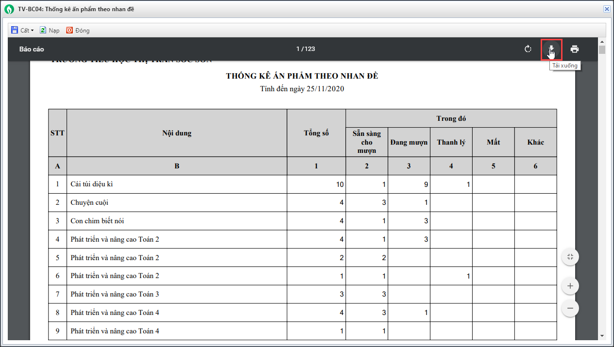 - Từ phiên bản R102: Phần mềm cho phép thống kê tổng số sách đang có tại thư viên theo từng đầu sách để báo cáo hiện trạng thư viện cho cấp trên.