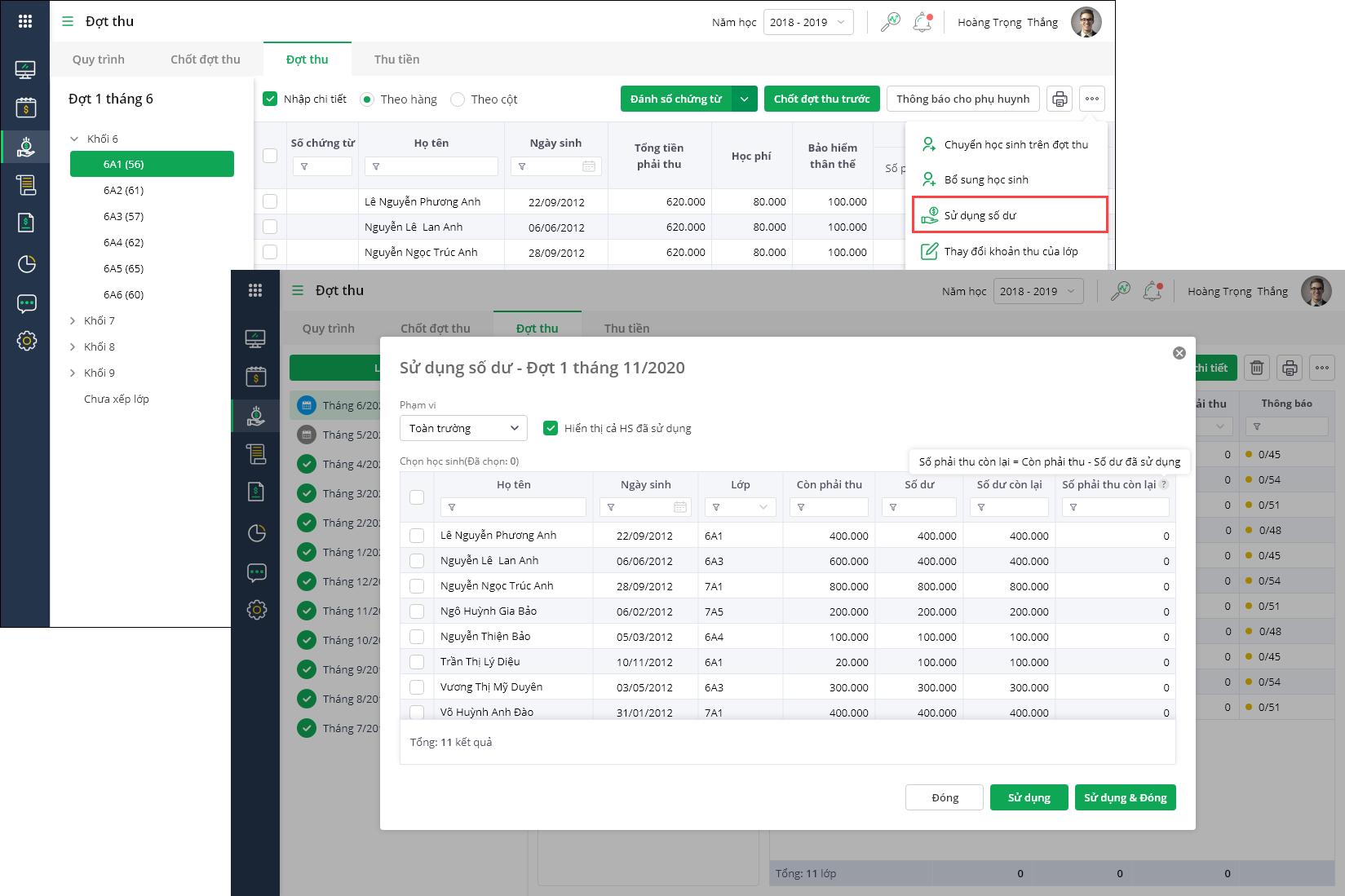 Khi sử dụng số dư cho các khoản thu tháng này thì phần mềm tự động tính số dư còn lại (=số dư – số dư đã sử dụng), Sổ phải thu còn lại (= Còn phải thu – số dư đã sử dụng) - Tích chọn học sinh sử dụng số dư, nhấn Sử dụng hoặc Sử dụng & đóng.