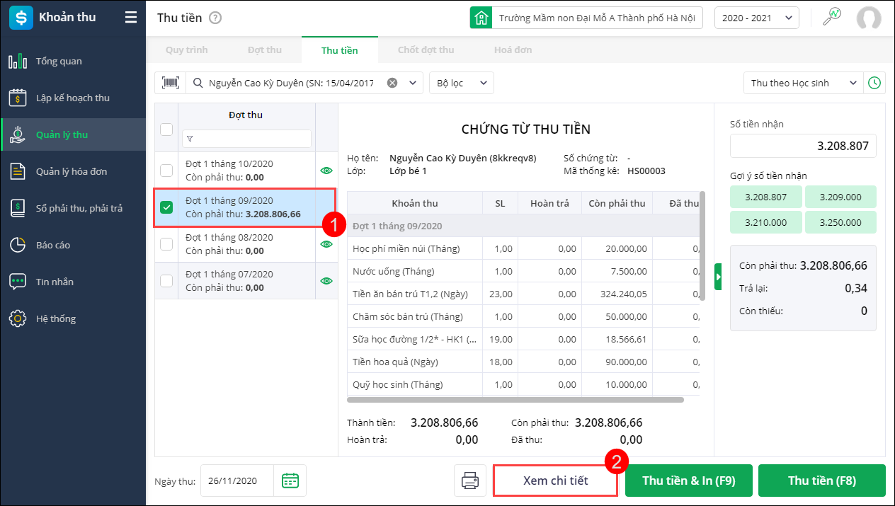 - Nhấn Xem chi tiết tại đợt thu cần thu tiền,