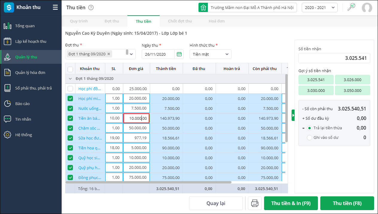- Trường hợp cùng khoản thu nhưng có nhiều mức thu khác nhau (tùy vào số buổi sử dụng thực tế của học sinh), anh/chị nhập lại đơn giá theo thực tế học sinh sử dụng tại cột Đơn giá