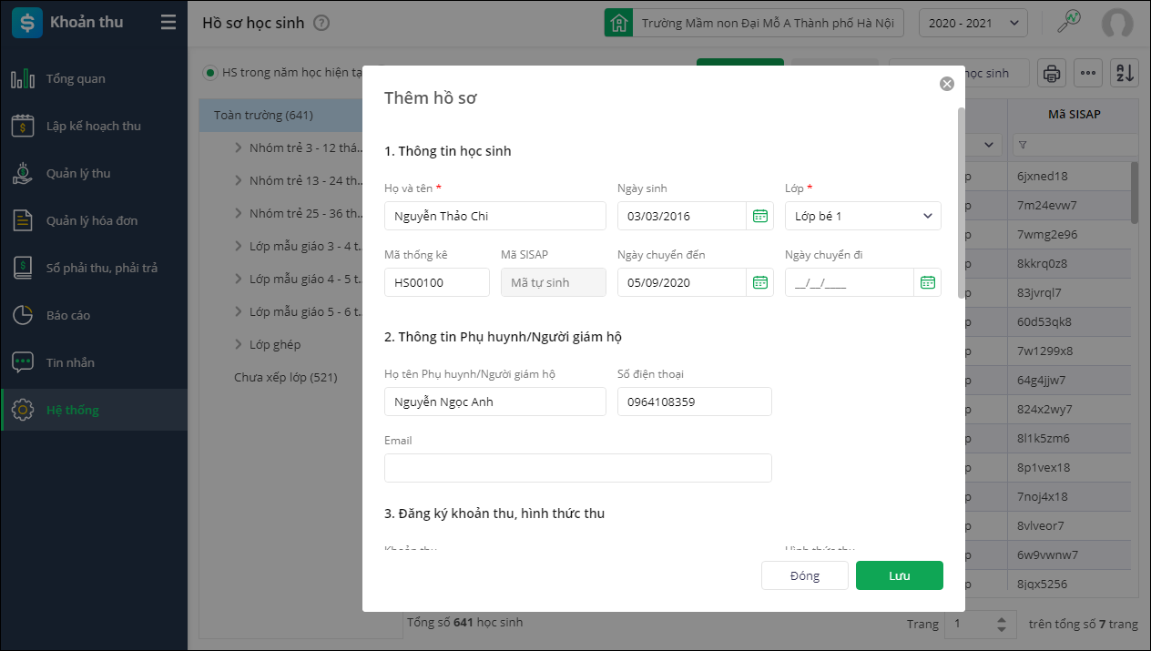2. Khai báo các Thông tin Học sinhThông tin phụ huynh/Người giám hộ, Mã thống kê học sinh