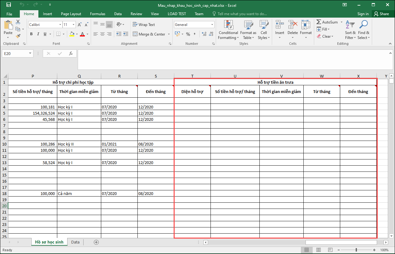 Bổ sung cột thông tin Hỗ trợ tiền ăn trưa trên file nhập khẩu khi thực hiện Nhập khẩu cập nhật và nhập khẩu đầy đủ hồ sơ học sinh.