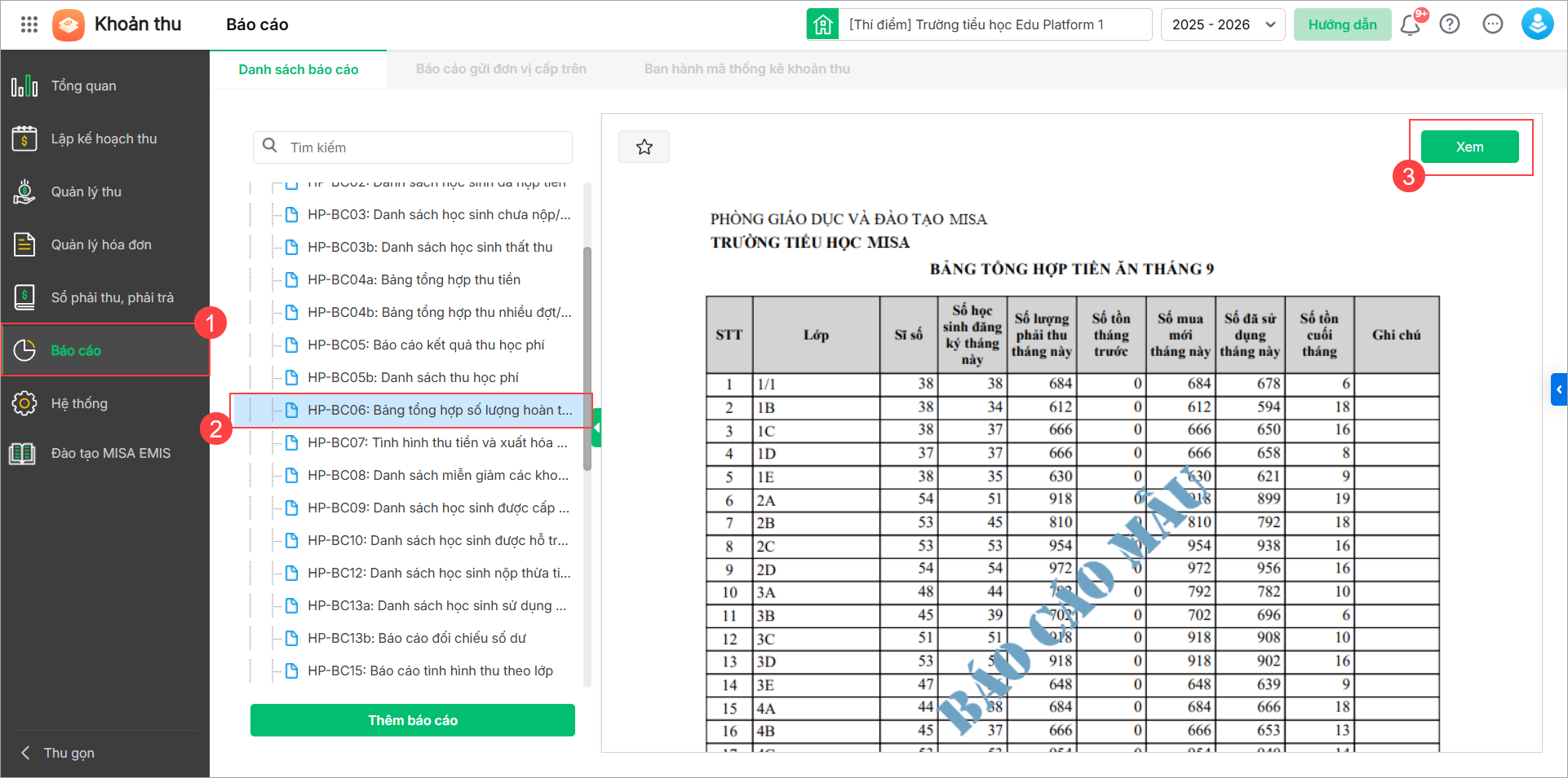 - Vào Khoản thu\Báo cáo, nhấn đúp chuột hoặc nhấn chọn HP-BC06: Bảng tổng hợp số lượng hoàn trả hàng tháng, chọn Xem.