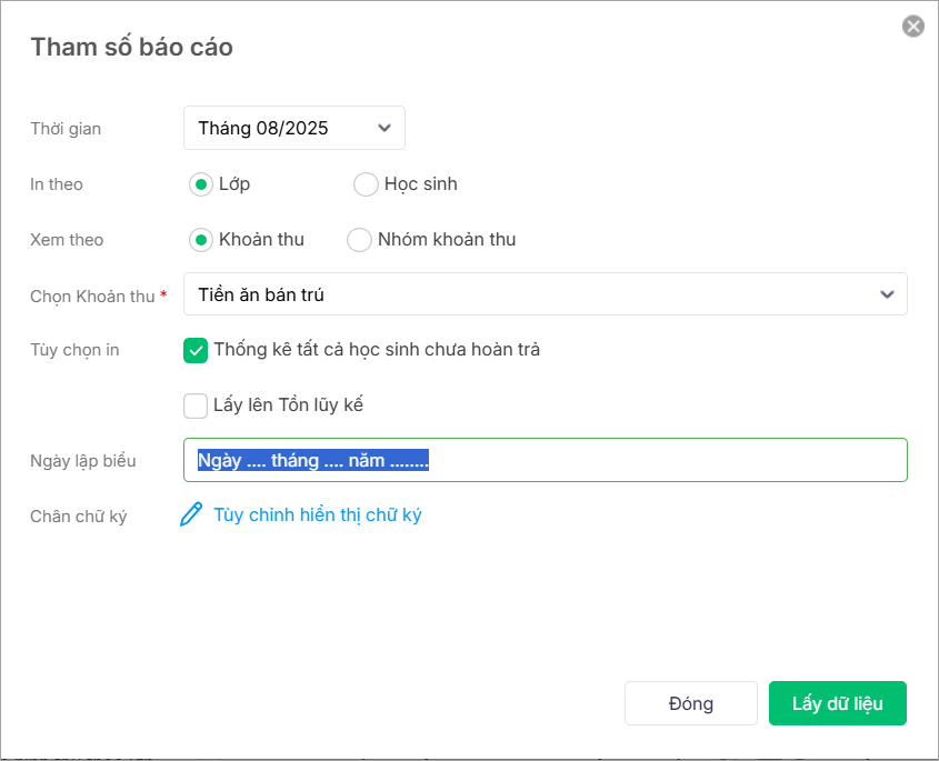 - Ngày lập biểu: Nhập ngày lập báo cáo.