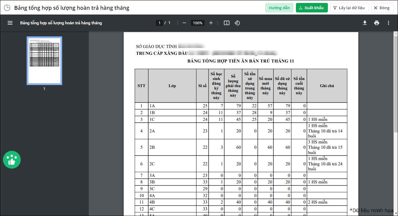 - Nhấn Lấy dữ liệu và kiểm tra số liệu trên báo cáo. Anh/chị có thể chọn Xuất khẩu để tải file dưới nhiều định dạng (PDF, Excel, Word)