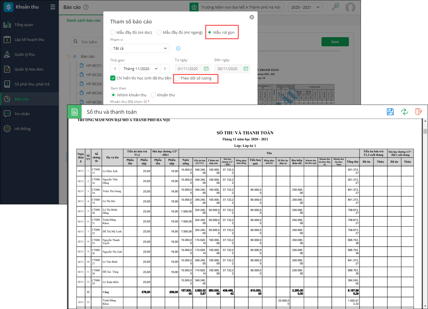 1. ào Khoản thu\Báo cáo\Danh sách báo cáo\HP-S01: Sổ thu và thanh toán