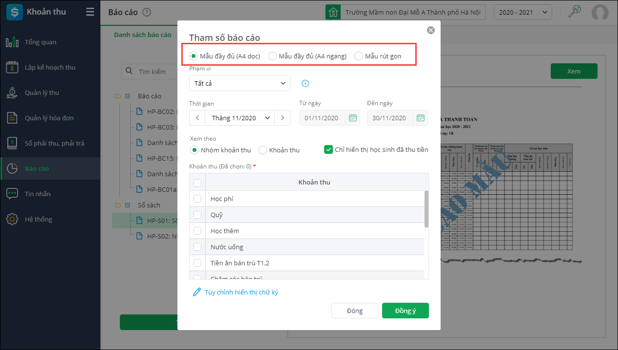 1. ào Khoản thu\Báo cáo\Danh sách báo cáo\HP-S01: Sổ thu và thanh toán