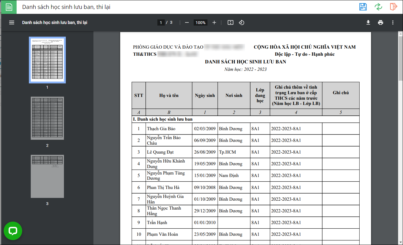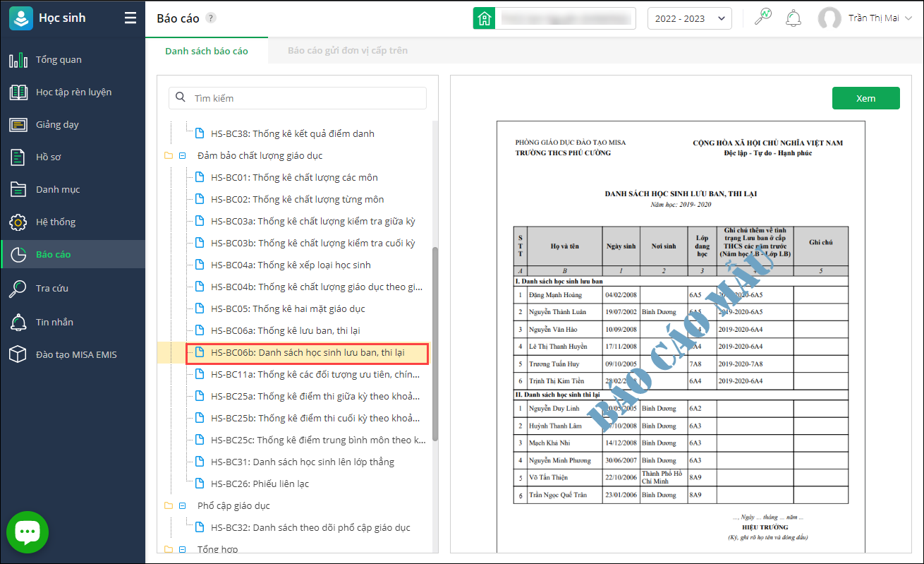 - Vào Báo cáo\Danh sách báo cáo\Đảm bảo chất lượng giáo dục. Chọn HS-BC06b: Danh sách học sinh lưu ban, thi lại.