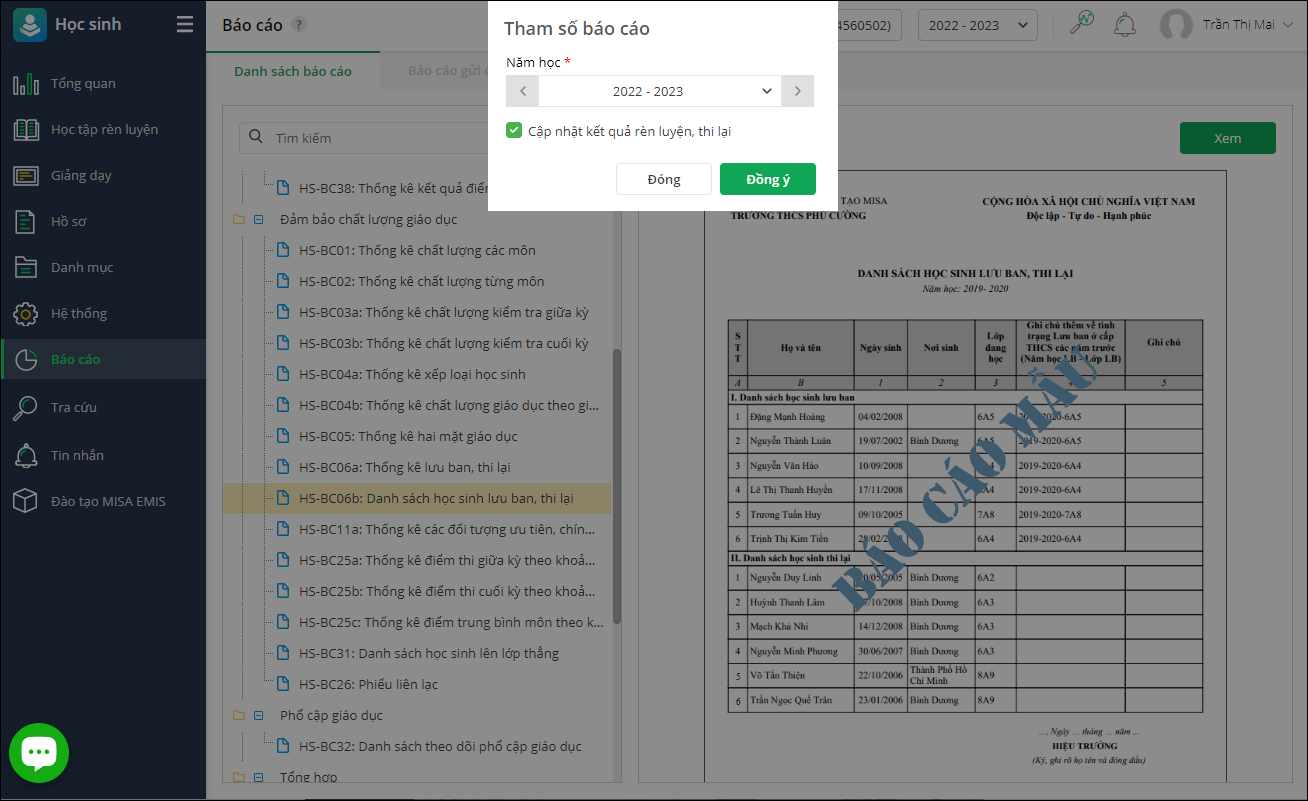 - Vào Báo cáo\Danh sách báo cáo\Đảm bảo chất lượng giáo dục. Chọn HS-BC06b: Danh sách học sinh lưu ban, thi lại.