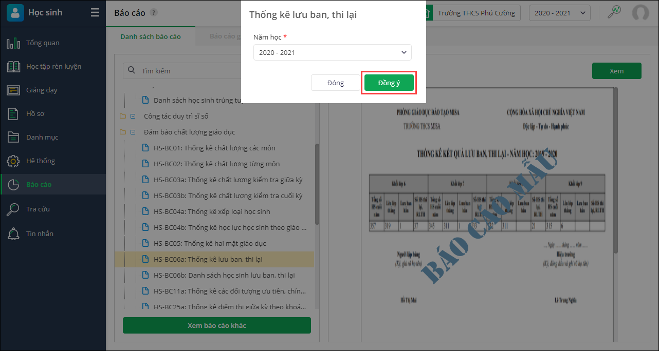- Nhấn Đồng ý và kiểm tra số liệu trên báo cáo.