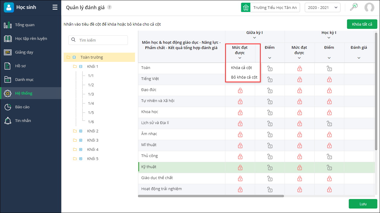 Lưu ý: Sau khi khóa sổ điểm thì giáo viên không thể thêm hoặc sửa con điểm, mức đánh giá đã khóa trên màn hình Đánh giá