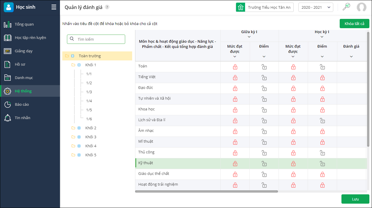 Lưu ý: Sau khi khóa sổ điểm thì giáo viên không thể thêm hoặc sửa con điểm, mức đánh giá đã khóa trên màn hình Đánh giá