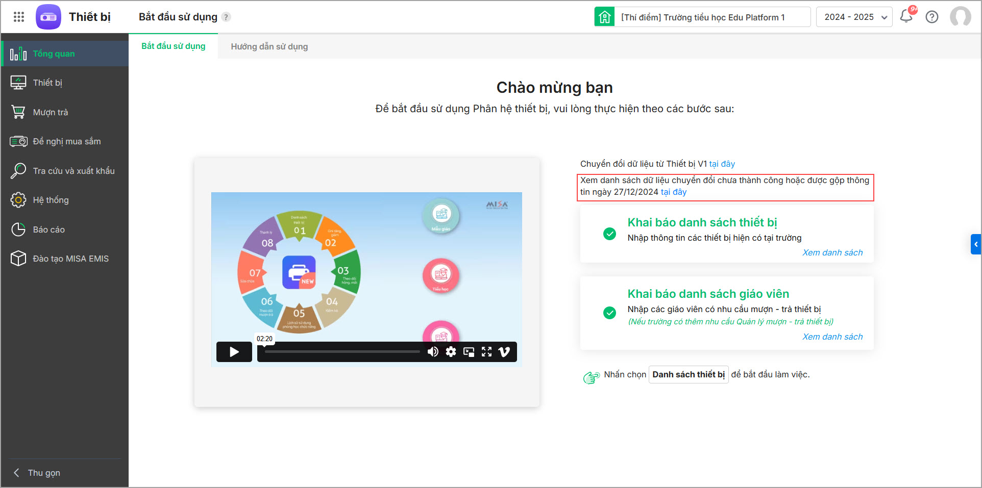 - Để thực hiện chuyển đổi dữ liệu thiết bị đang quản lý trên phiên bản Thiết bị V1 lên V2, tại màn hình Bắt đầu sử dụng, nhấn vào Tại đây.