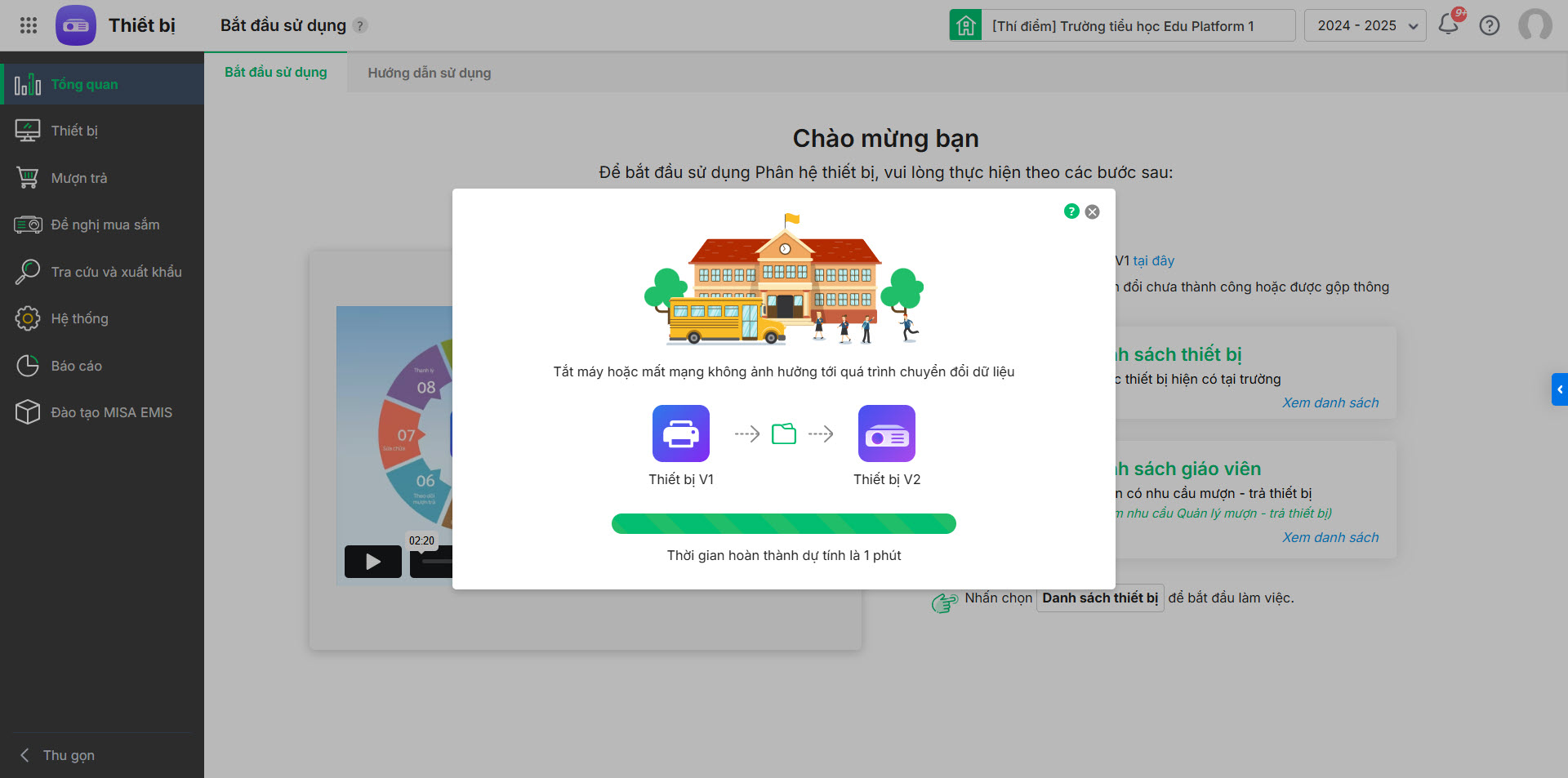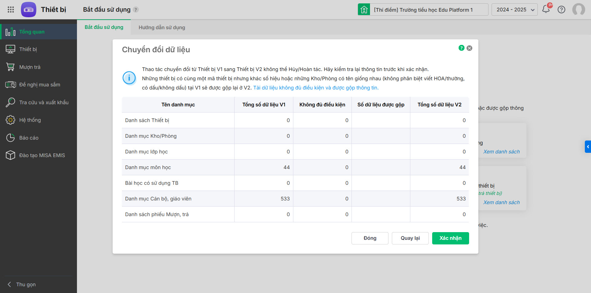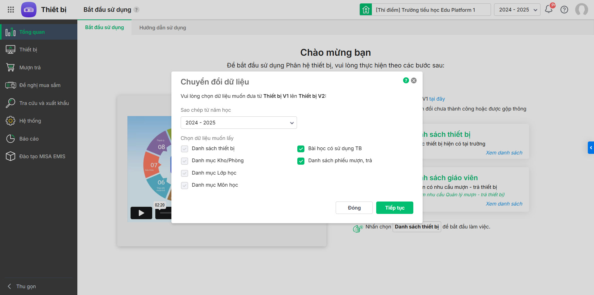- Chọn dữ liệu muốn lấy từ phiên bản V1 lên phiên bản V2. Các dữ liệu Danh sách thiết bị, Danh mục kho phòng, Danh mục lớp học, Danh mục môn học được mặc định lấy lên.