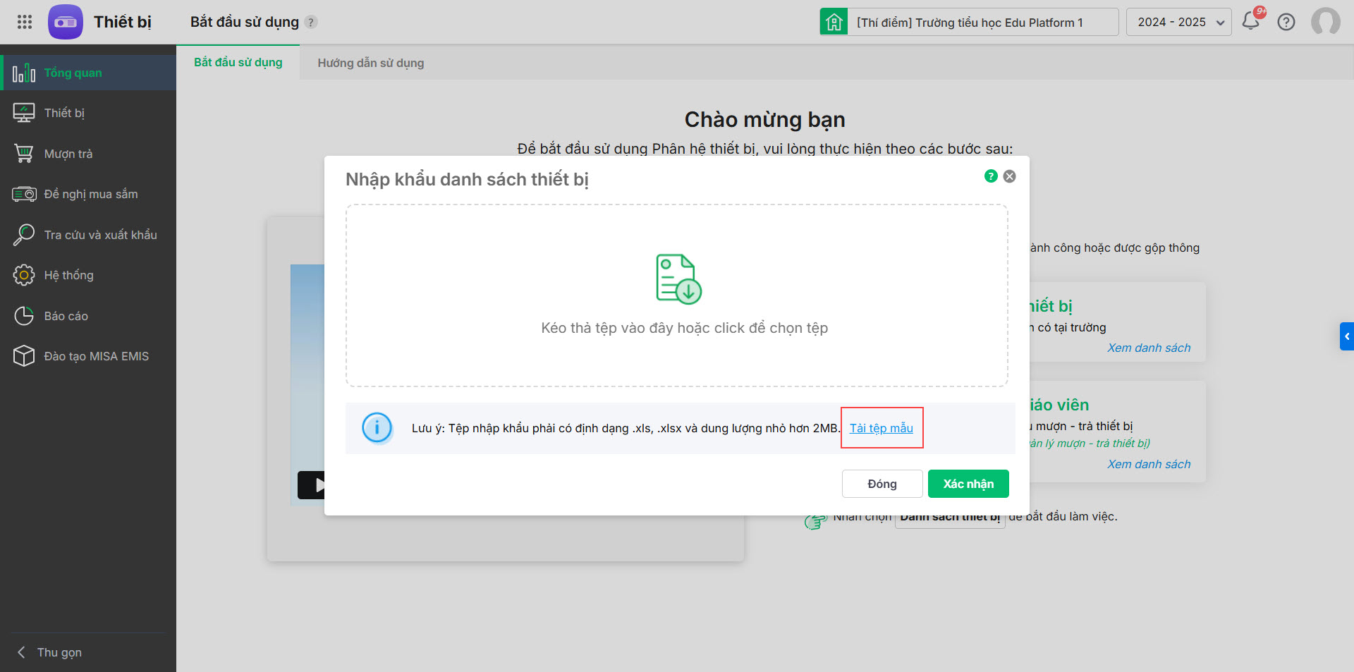 - Tải tệp mẫu excel nhập khẩu danh sách thiết bị do phần mềm cung cấp.
