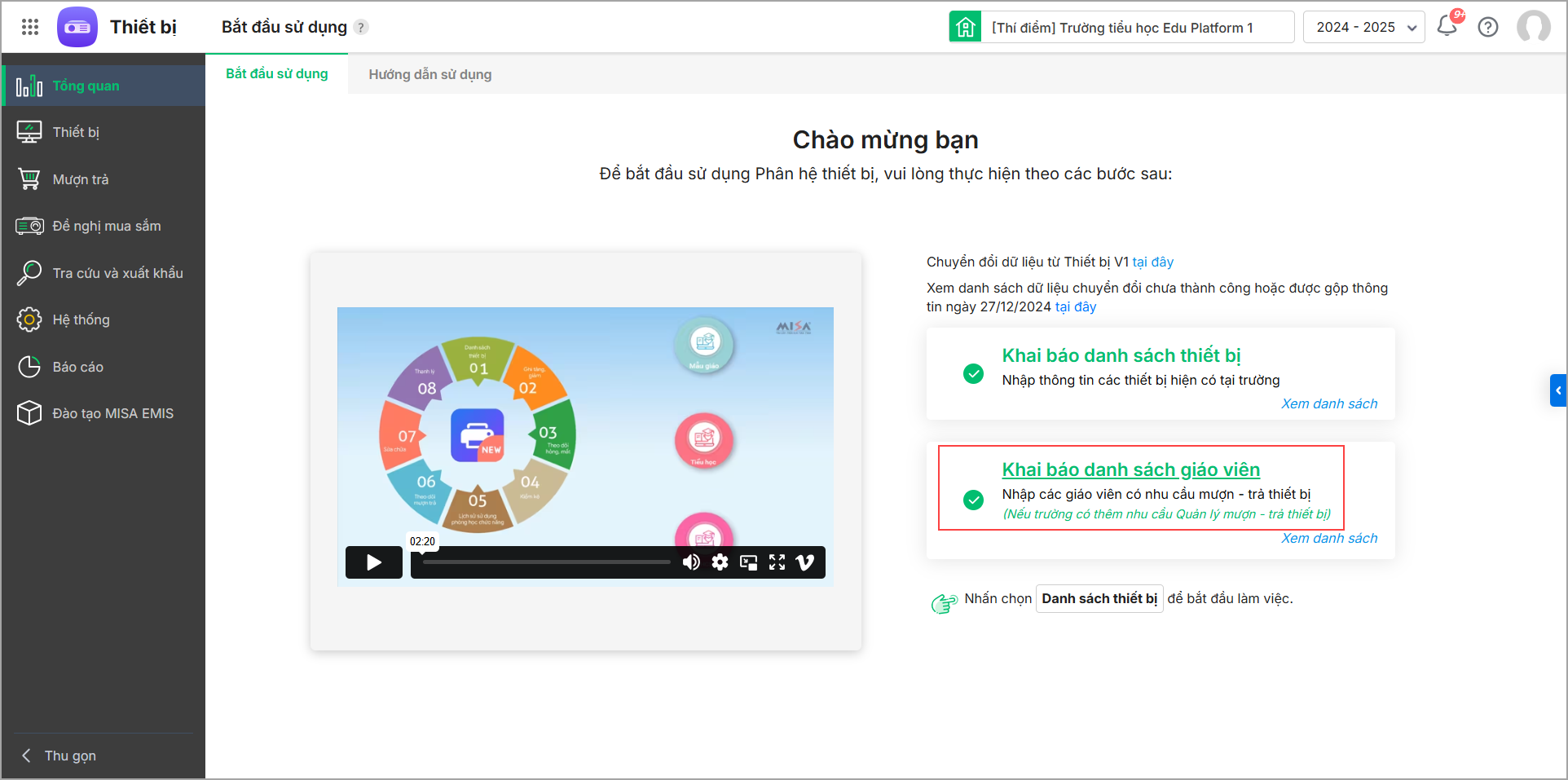 Anh/chị thực hiện khai báo danh sách giáo viên để phục vụ cho công tác quản lý mượn trả thiết bị tại đơn vị mình.