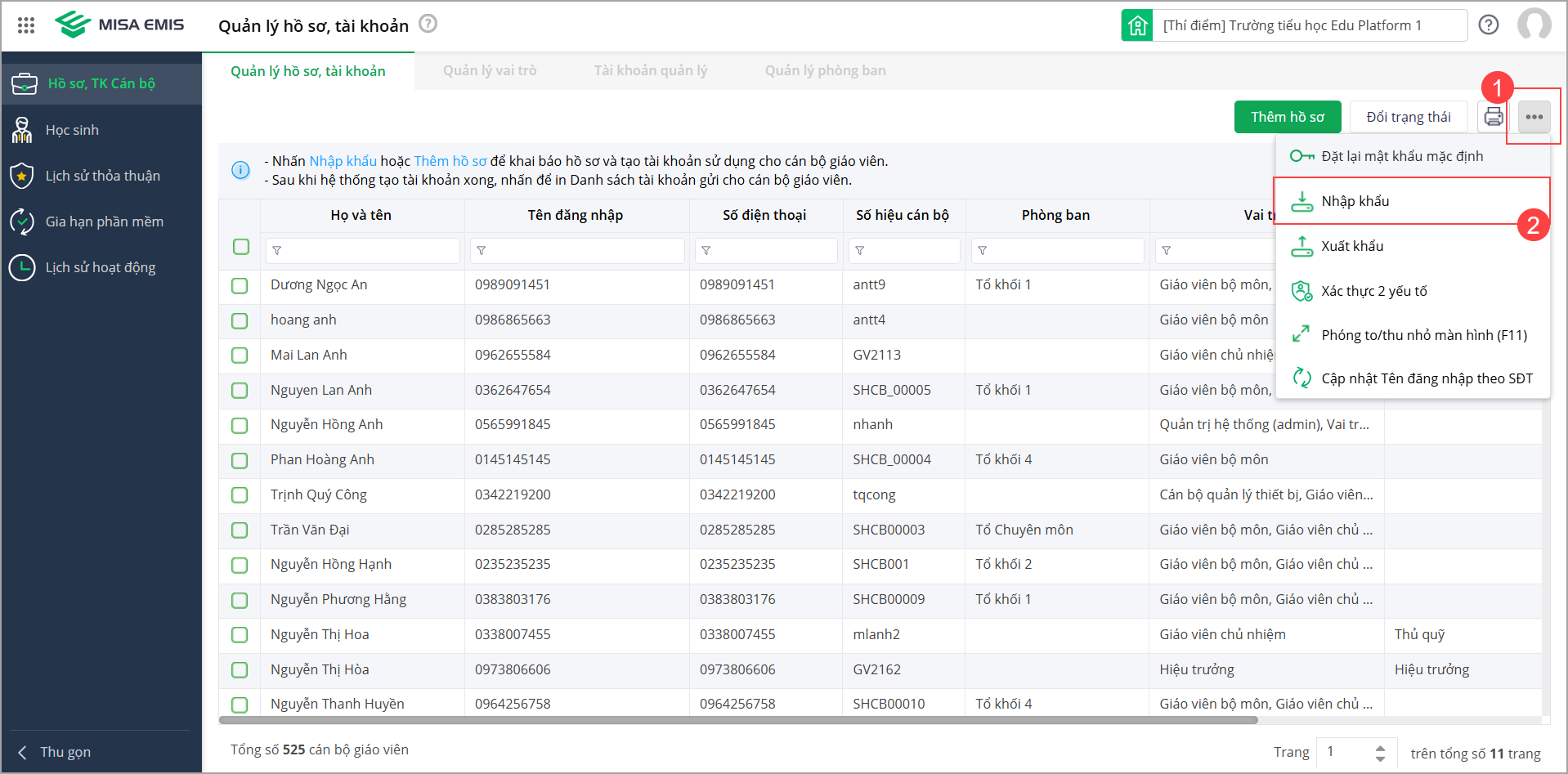 Nhập khẩu thông tin giáo viên có sẵn từ tệp excel của đơn vị lên phần mềm.