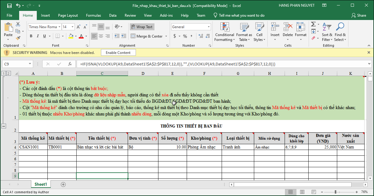 - Sao chép/ nhập danh sách thiết bị từ tệp sổ theo dõi/excel của đơn vị đang quản lý sang tệp excel mẫu vừa tải.