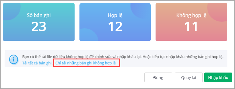 - Nhấn Tải tất cả bản ghi để xem toàn bộ danh sách bản ghi (bao gồm bản ghi hợp lệ và bản ghi không hợp lệ) hoặc Chỉ tải những bản ghi không hợp lệ và thực hiện chỉnh sửa, nhập khẩu lại vào phần mềm.