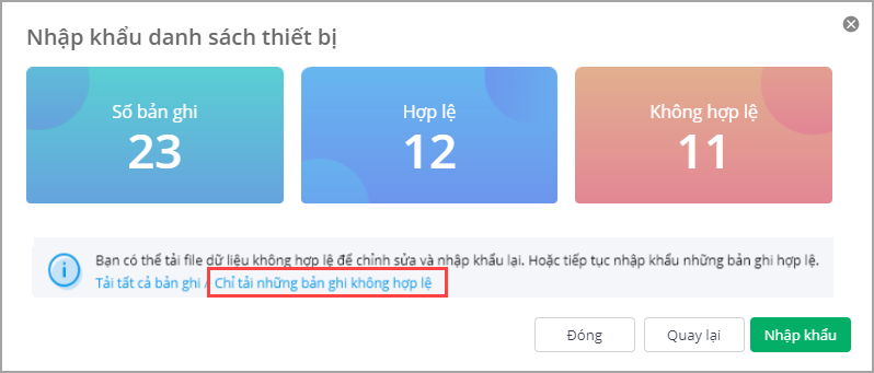 - Nhấn Nhập khẩu để nhập khẩu bản ghi thông tin thiết bị hợp lệ vào phần mềm.