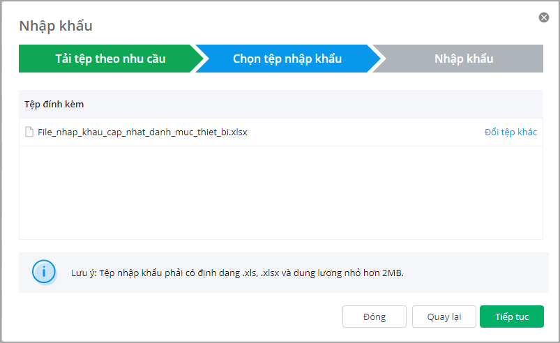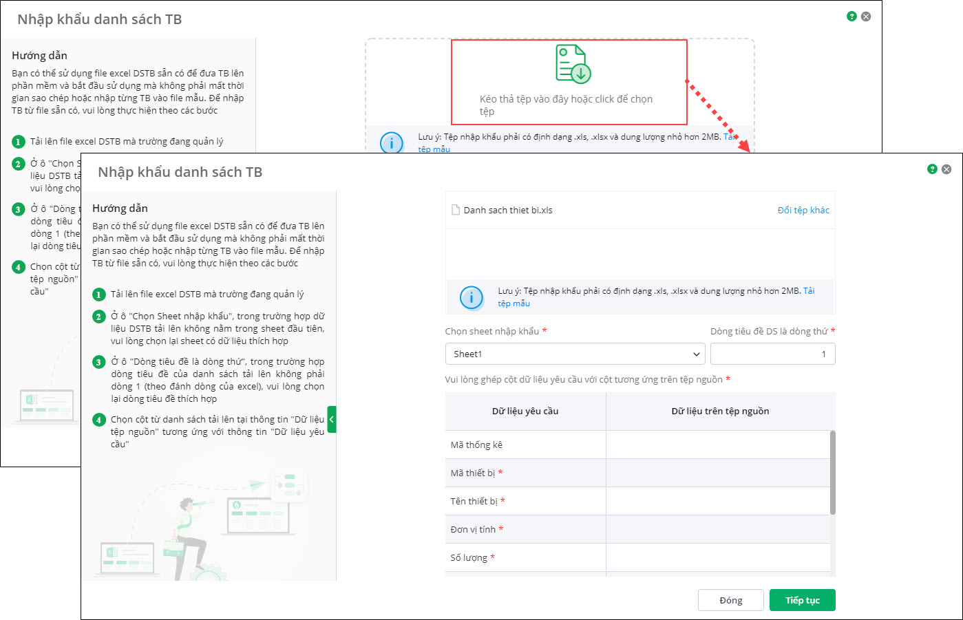 - Chọn sheet nhập khẩu: trường hợp dữ liệu danh sách thiết bị không nằm trong sheet đầu tiên, anh/chị chọn lại sheet chứa dữ liệu danh sách thiết bị.