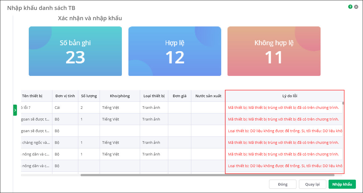 - Trong trường hợp tệp nhập khẩu bị lỗi anh/chị kiểm tra lại thông tin các bản ghi phần mềm báo lỗi để thực hiện nhập khẩu lại.