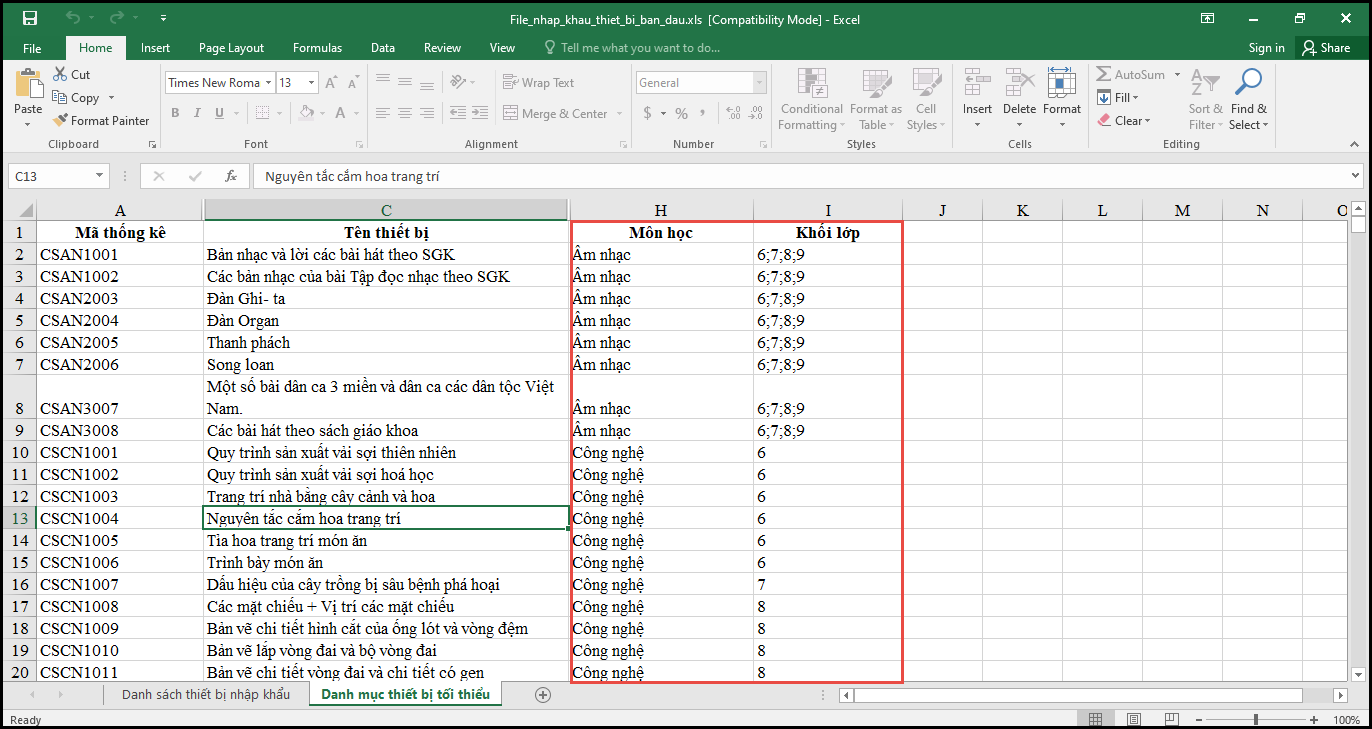 - Tại sheet Danh mục tham khảo của file mẫu nhập khẩu, anh chị có thể theo dõi thông tin thiết bị được sử dụng cho môn học và khối lớp tương ứng.