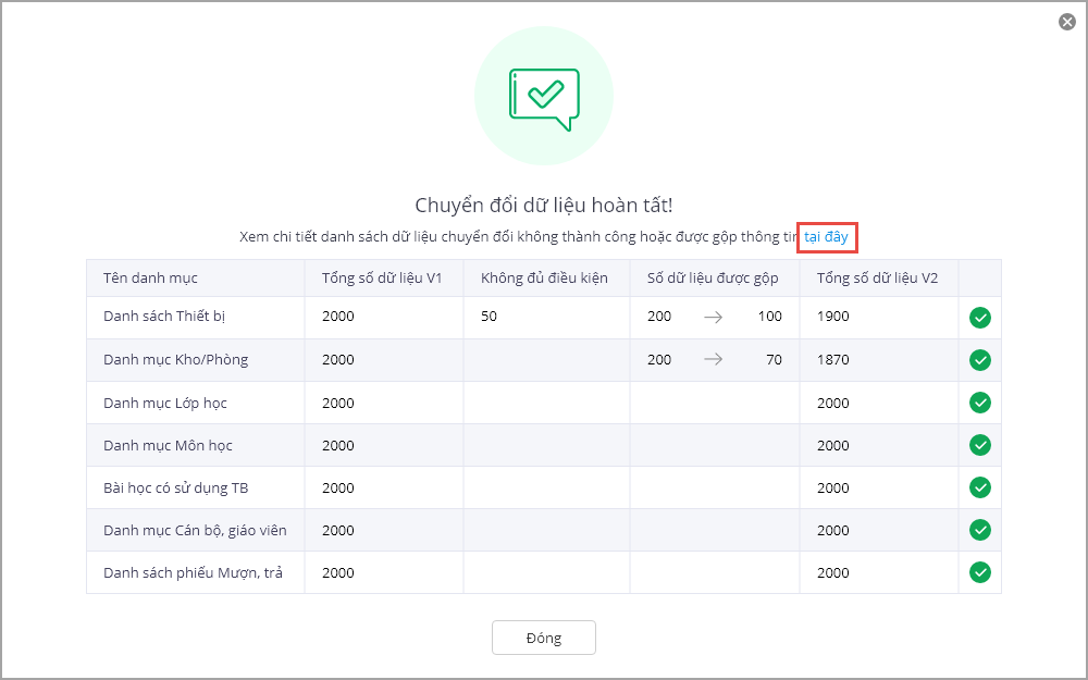 Nhấn vào Tại đây để kiểm tra danh sách dữ liệu chuyển đổi không thành công và các thiết bị đã gộp số hiệu thiết bị. - Sau khi chuyển đổi, anh/chị có thể xem lại danh sách dữ liệu chuyển đổi chưa thành công sau của lần chuyển đổi dữ liệu gần nhất.