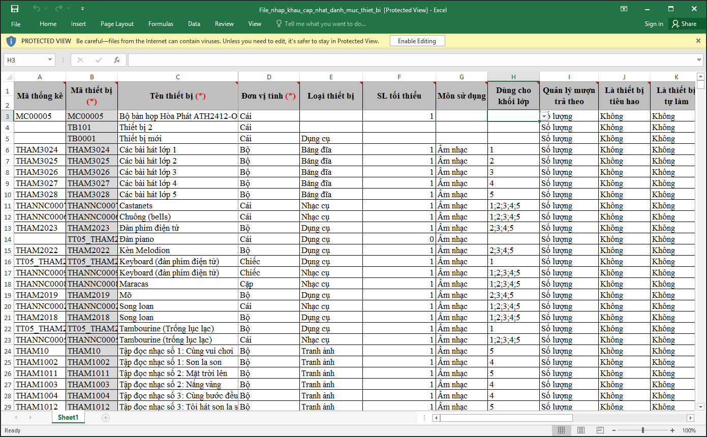 • Nhập khẩu mới/tải tệp mẫu rút gọn: Nhập khẩu nhanh thông tin cơ bản của học sinh: Tên thiết bị, Đơn vị tính.