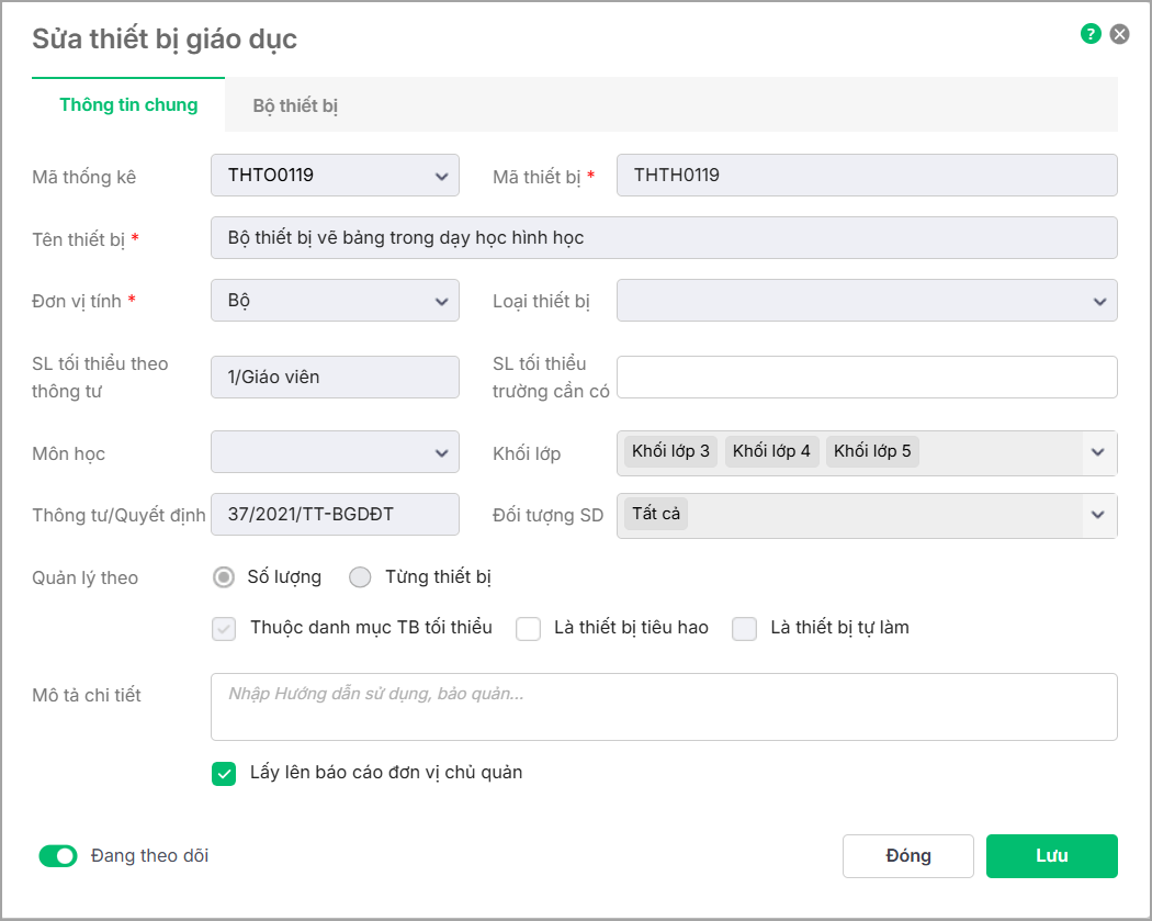 Lưu ý: Để phục vụ cho công tác báo cáo gửi đơn vị chủ quản, anh/chị nên nhập Mã thống kê (là mã thiết bị theo danh mục thiết bị dạy học tối thiểu do đơn vị chủ quản ban hành)