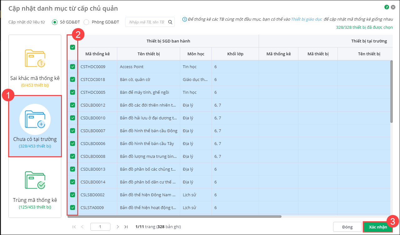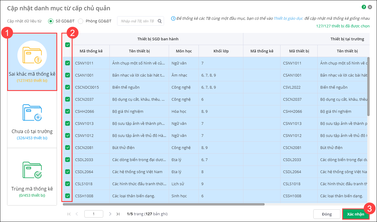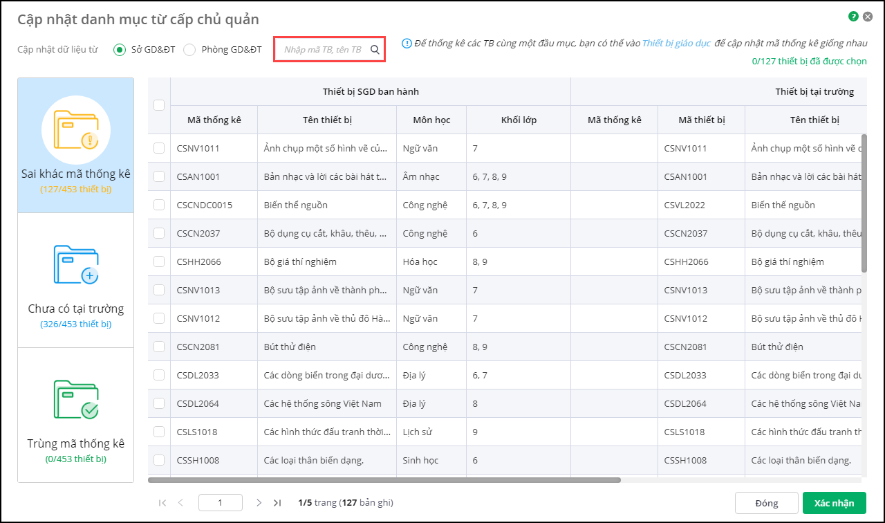 4. Đầu tiên, anh/chị tiến hành cập nhật những thiết bị Sai khác mã thống kê bằng cách tích chọn các thiết bị và nhấn Xác nhận.
